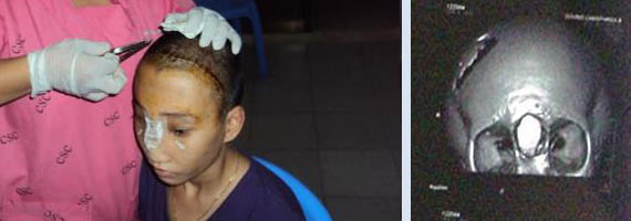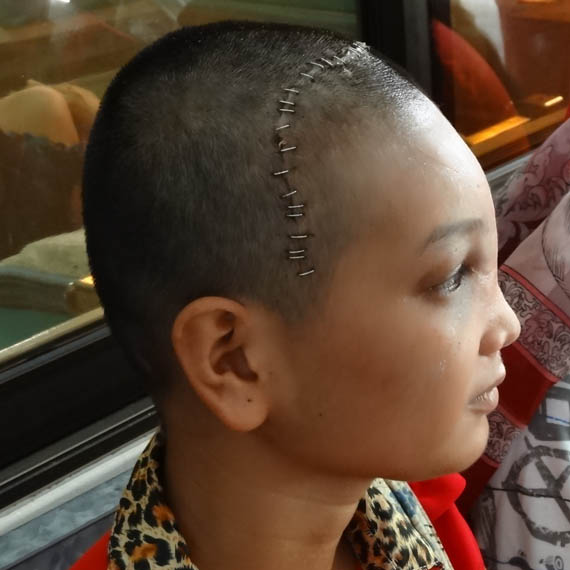 Makara ready for removal of her sutures at day 10. Note the incision made above her hair line to minimise disfigurement.