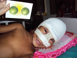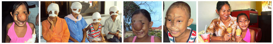 The condition causes significant distress, may interfere with vision, tear ducts and sinuses and often results in community out-casting of the individual, especially in poor village situations where it is most prevalent. Rupture of or injury to the MEC carries a very high risk of infection and death. During Cambodian assignments, Jock Struthers came across young people with the condition and located a remedy at the Children’s Surgical Centre in Phnom Penh, a hospital run by Orthopaedic Surgeon Dr Jim Gollogly. (www.csc.org ).