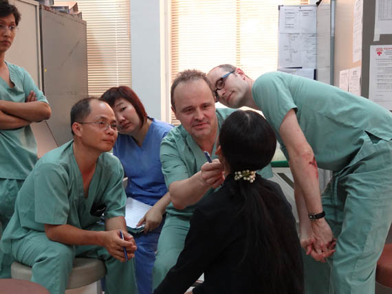 French Surgeon Dr Fred Lauwers and colleague with Chief Khmer Surgeon Dr Ngiep examine a patient prior to surgery.