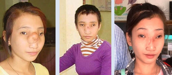 Sotheavy, aged 21 from Banteay Meanchey Province, seen before and three months after her operation and 3 years later, after plastic surgery is complete. Sotheavy has since married.